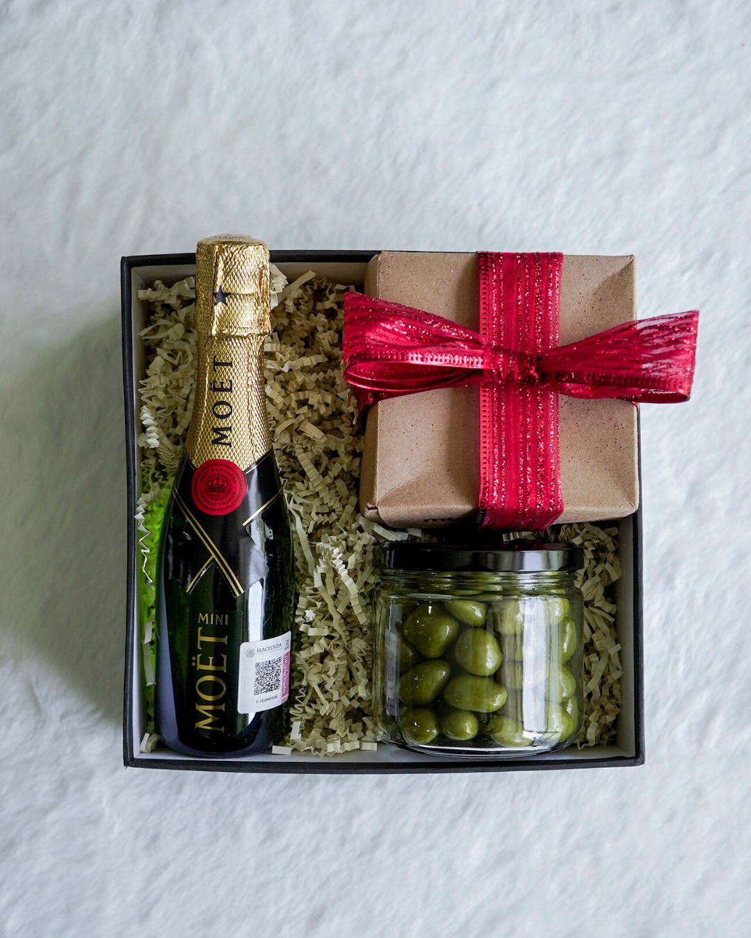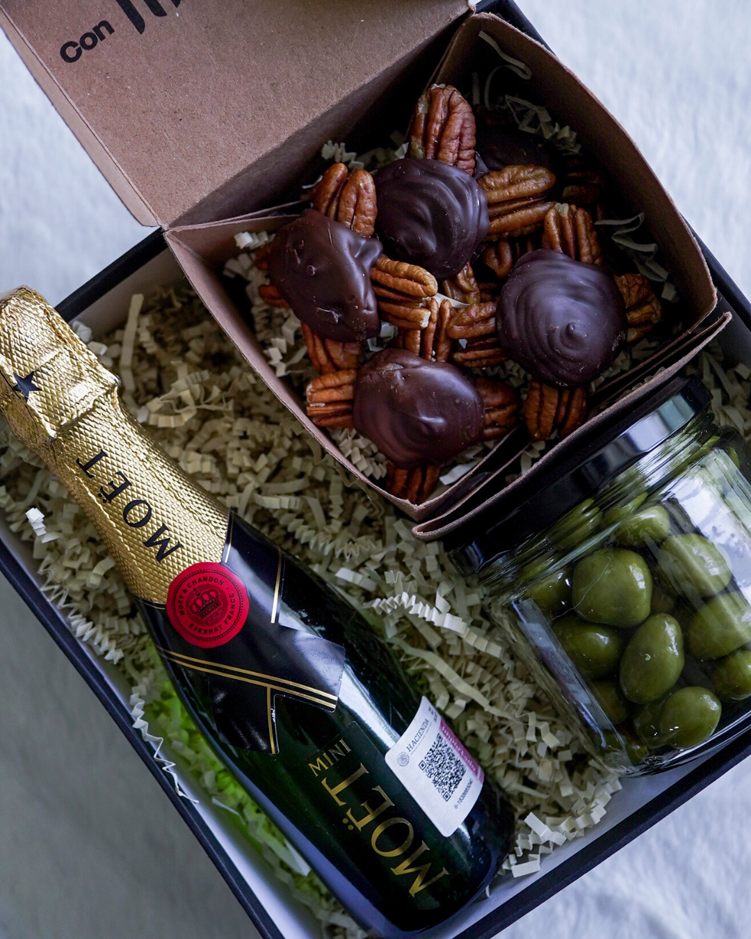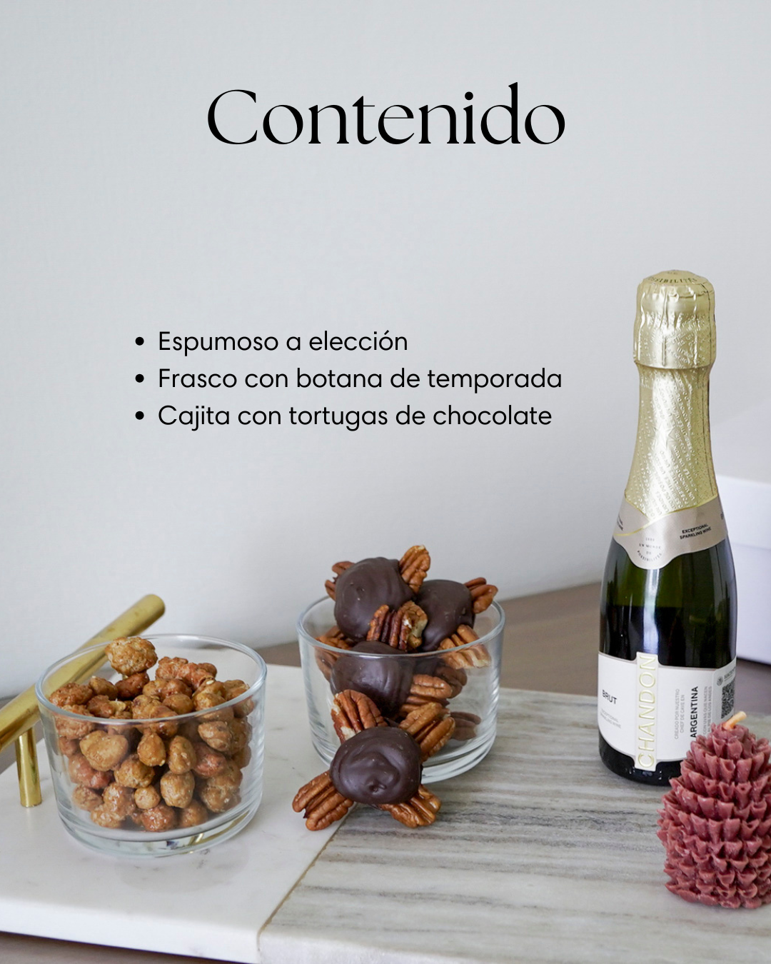 Incluye una botella de vino espumoso chico, una selección de snacks de temporada y unas deliciosas tortugas de chocolate. Ideal para brindar con dulzura y estilo.