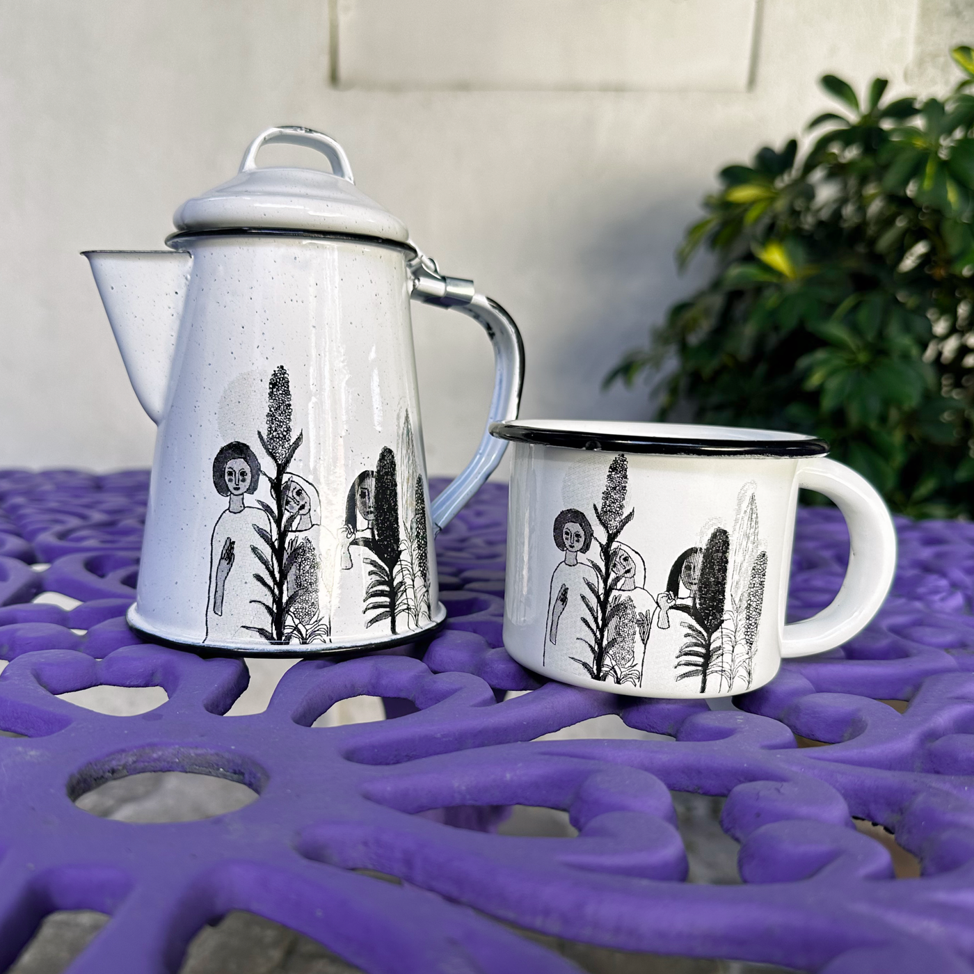 Pocillo de peltre con capacidad de 250 ml. Tetera de 500 ml