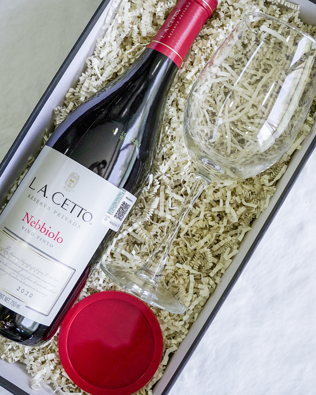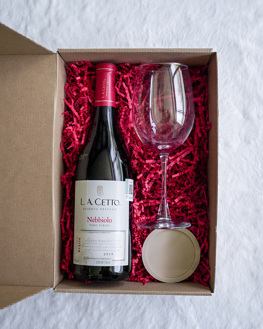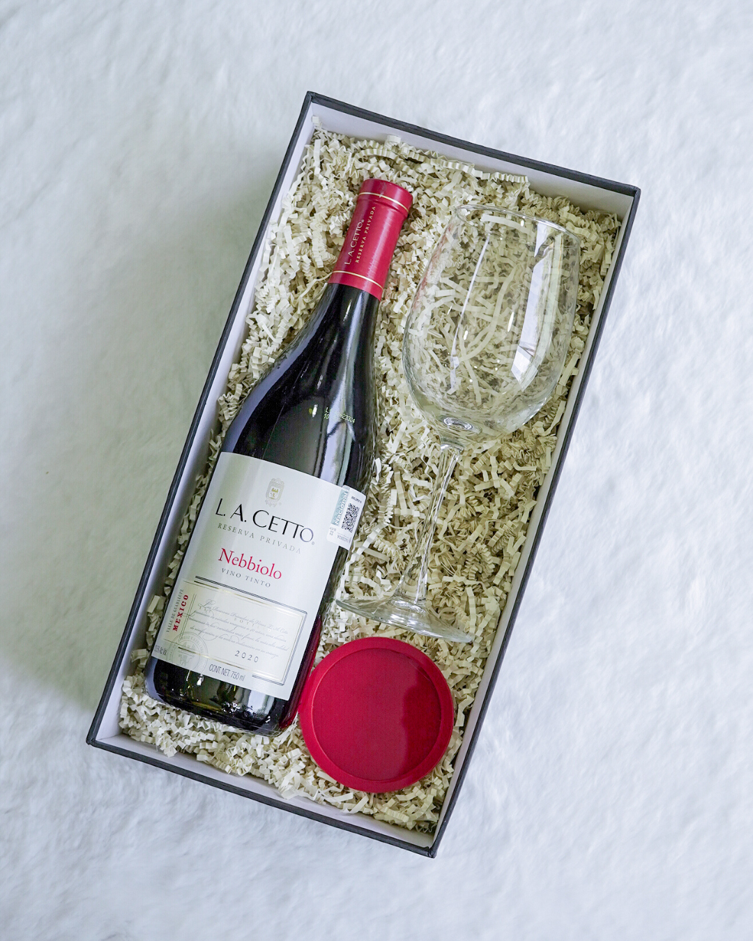 Contiene una botella de LA Cetto de 750 ml, una copa de vidrio personalizada y un plato cubre copa con el toque ideal para acompañar cada brindis. Viene en caja premium, listo para sorprender y compartir.